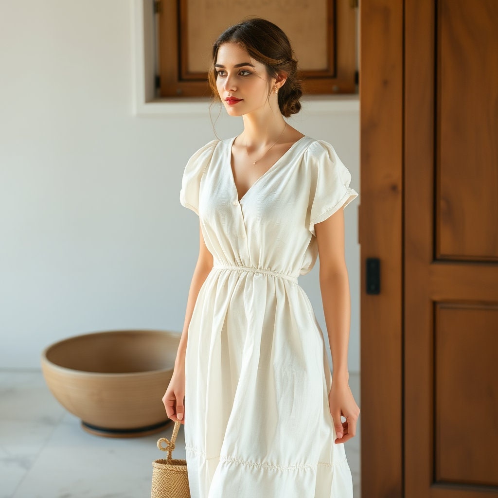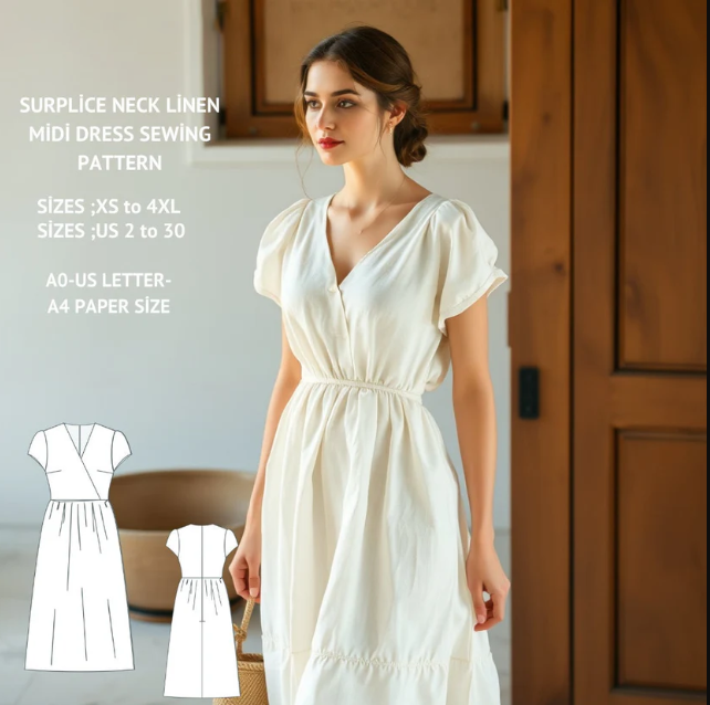 Surplice Neck Linen Midi Dress Sewing Pattern,Sundress Pattern,Spring Dress,Gathered Dress,Puff Sleeve Dress,Ladies size;XS to 4xl