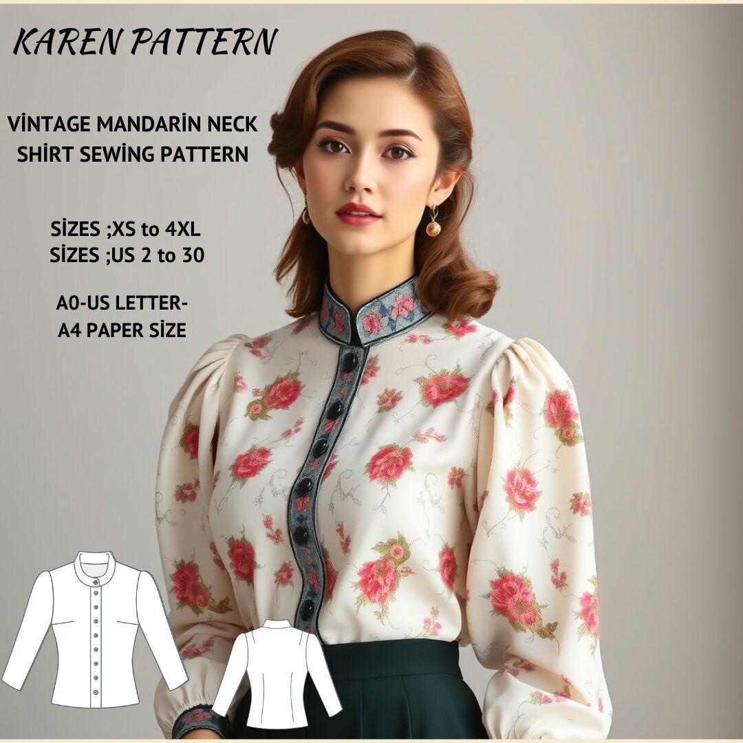Vintage Mandarin Neck Shirt Sewing Pattern:US 2-30, XS-4XL (Digital Download)
