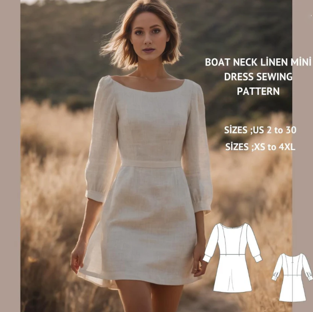 Boat Neck Linen Mini Dress Sewing Pattern (US 2-30, XS-4XL)(Digital Download)